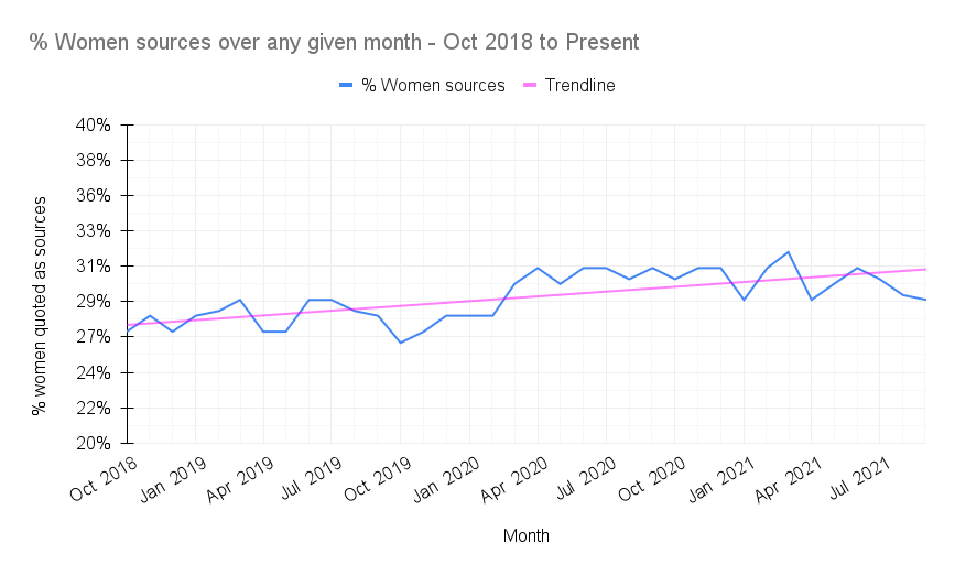 Percentage of women sources in news stories from October 2018 through October 2021. (Courtesy: Gender Gap Tracker)