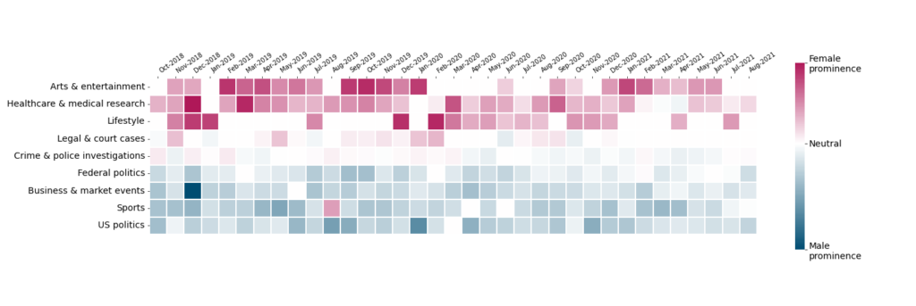 Monthly gender prominence by topic of sources in news stories from October 2018 through October 2021. (Courtesy: Gender Gap Tracker research dashboard)