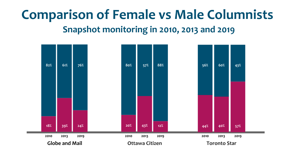 Although we didn’t receive a response to our query from the Globe, the reduction in female voices on the columnist side may be partly a function of the recent retirement of Margaret Wente, who previously wrote three times a week. (In our 2010 research, her views made up 40% of the female perspective published on the paper’s comment pages.)