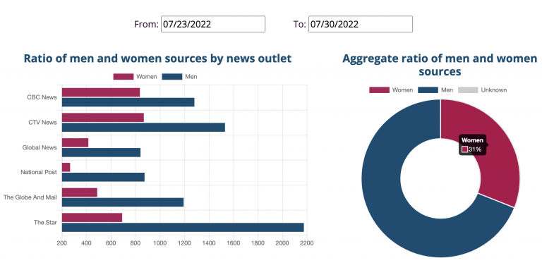 That was the impetus for our Gender Gap Tracker, which measures in real time the ratio of women vs men being quoted in Canada’s most influential news outlets. (This matters because diversity of sources is a measure of quality journalism. And the news media should reflect the realities and concerns of the population they serve — 50% of whom are women.)