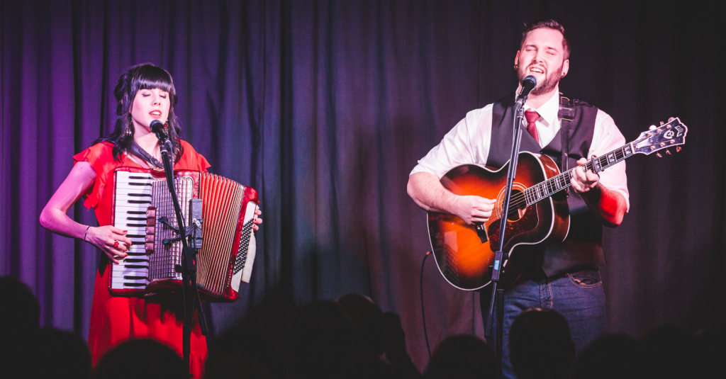 Another night, another free concert at the same venue, and another minor technical problem. But this time, Andrew James O’Brien and Catherine Allan of the dynamic Newfoundland duo, Fortunate Ones, speak to the audience while waiting for the glitch to be fixed.