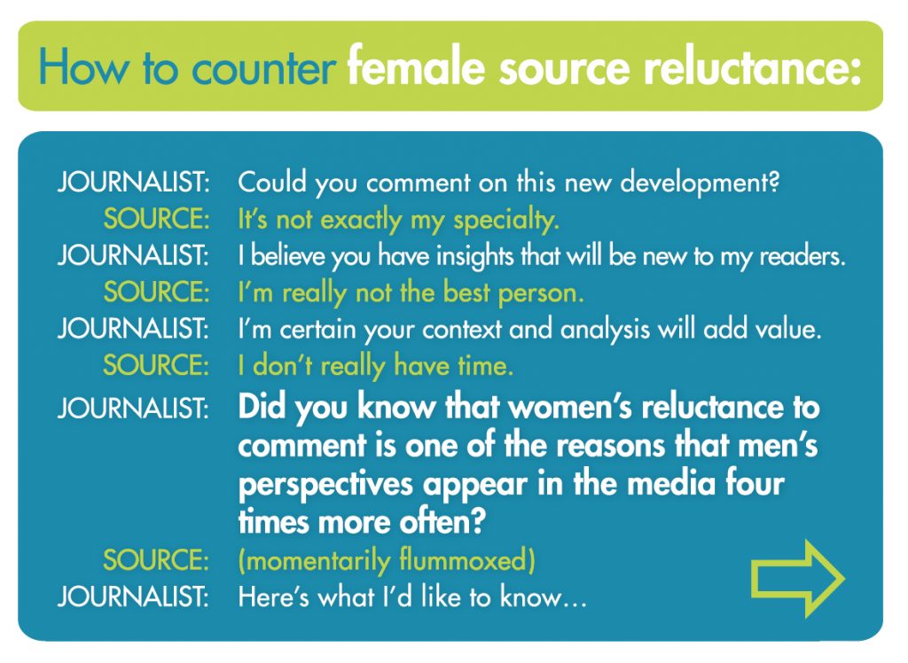 Elected officials often default to canned talking points or partisan interests. Journalists know this and actively seek to challenge the default in interviews. But an additional workaround would be to do a more rigorous job of supplementing government news releases with more alternative sources — including women and other underrepresented populations who are able to speak to the disparate experiences of citizens affected by the policy being proposed.